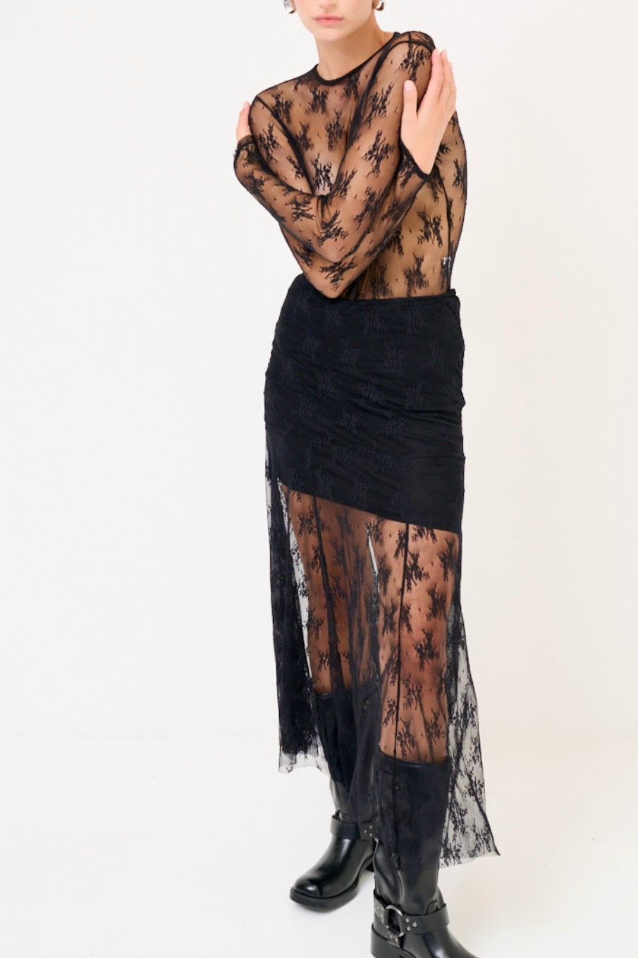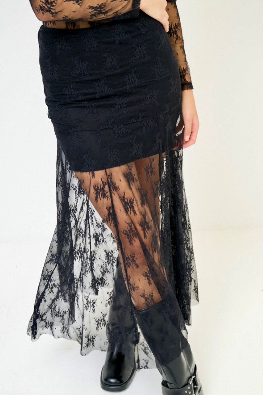 Gonna lunga svasata in pizzo con sottogonna corro. Elasticizzata in vita.