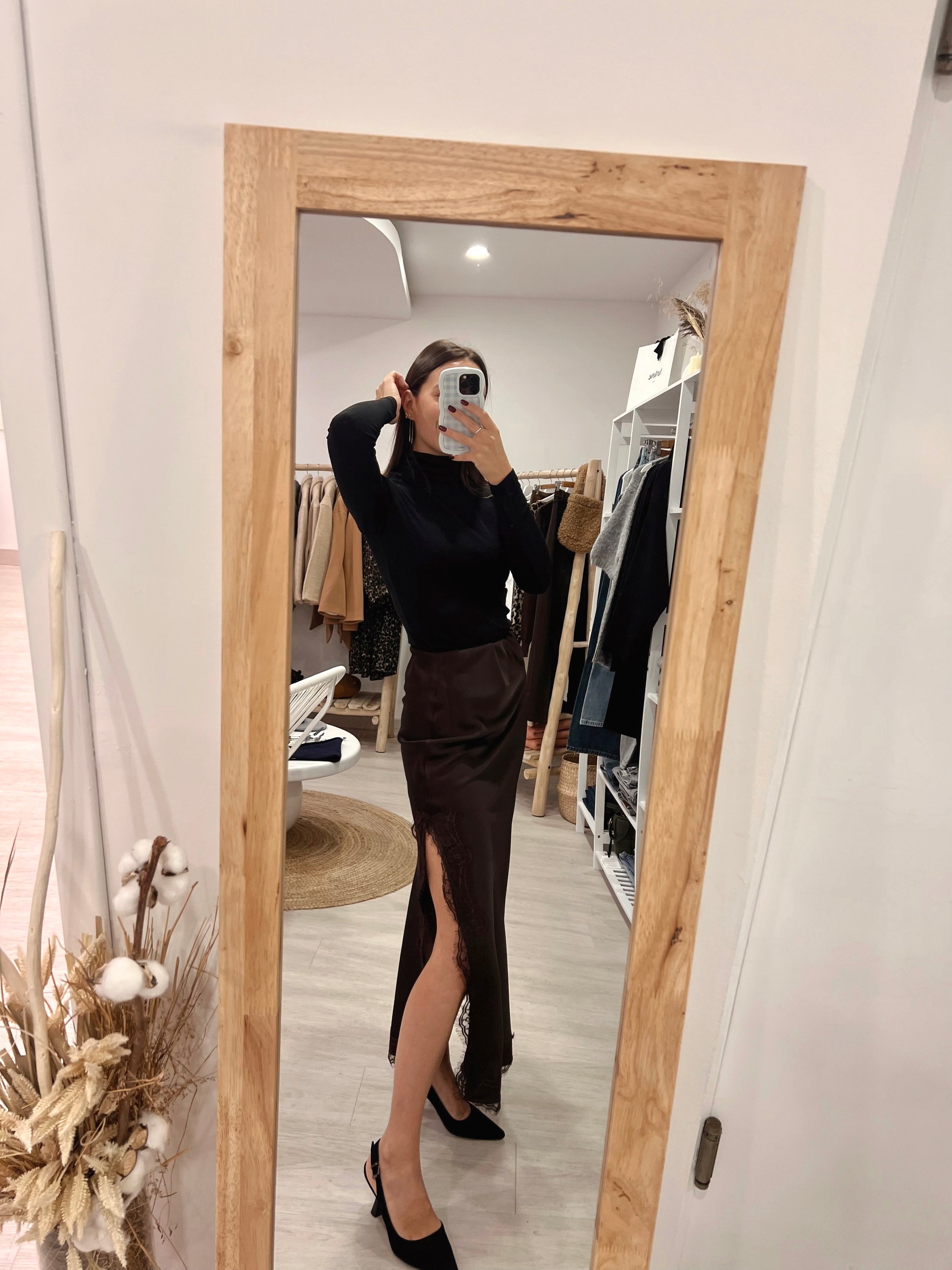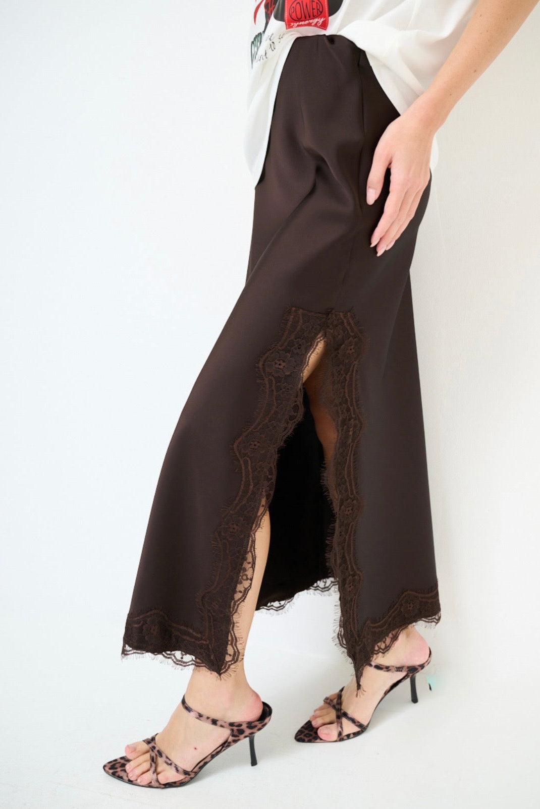 Gonna a matita in raso e pizzo con spacco laterale ed elastico in vita.